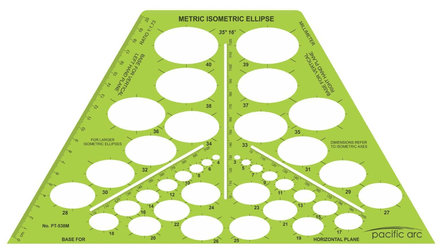 Isometric Ellipse Template Metric 35 & 16 Degrees: Contains: thirty-eight ellipses. Size 13.25" x 7.25".
